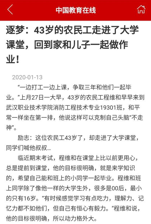 [中国教育在线]逐梦:43岁的农民工走进了大学课堂,回到家和儿子一起做作业!
