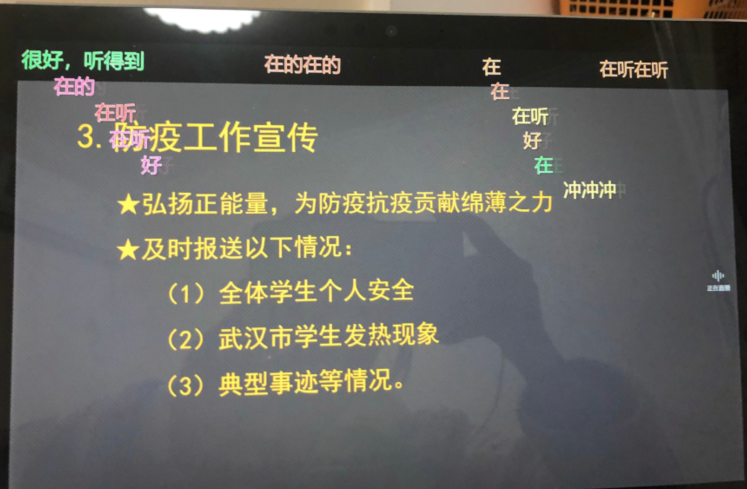 肖老师打开提前精心准备的班会课件,带领学生学习了全省疫情防控精神、武职师生参与“战疫”中的故事、新学期线上课程安排等,并针对学生提出的“疫情期间‘我们怎么做’、怎样进行心理疏导、怎样上好网上课程、怎样合理安排学习时间等问题进行答疑解惑,希望学生做好个人防护,对战胜疫情要有信心,要有正确的辨别能力,不信谣、不传谣,每天完成“平安报’,不提前返校。全体学生表示,这场特殊的线上班会增强了我们战胜疫情的决心,感受到了学校老师的温情关怀。在班会上,学子们纷纷发送“网络开学后,我们要互帮互助,抱团取暖”“上课没明白的集中反馈给老师”“没有过不去的寒冬,没有不到来的春天”“武汉加油”、“携手共进,战胜疫情”等弹幕心声。