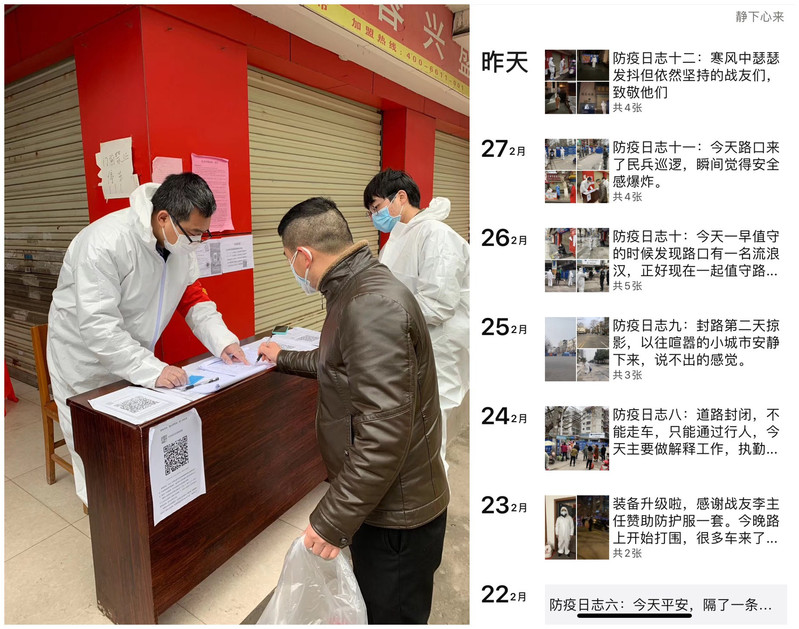 “疫情日记:今天出门的群众很少,但遇到一个流浪汉,我和一起值守的民政局工作人员一起将其交给救治中心。晚上值守的时候,有一个兄弟登记完塞给我四个口罩,他说他家里多备了一些口罩,送你几个,你们辛苦了!顿时让我觉得身后有无数人正在用自己的方式对这次疫情防控尽最大的支持。”这是党员黄大海在朋友圈发的疫情日记,而这份日记已经写了十三天。谈及志愿服务感受,他说:“作为一名党员,能出点力就出点力,比起医务人员,我做的这点不算什么!”