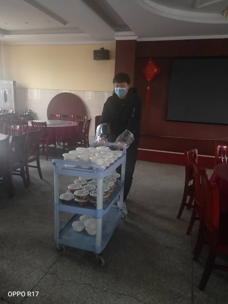 隔离点的一日三餐都是黄炎从厨房推着餐车送往分餐点,这条路也是黄炎每天走的最踏实的一条路,因为它意味着隔离人员和一线防疫工作者马上就可以吃到热腾腾的营养餐。送餐之后回到厨房,黄炎还会帮着阿姨们打扫卫生,在他眼里阿姨们既是战友也是长辈,在这一段共同战“疫”的时光里他们建立了坚固的情谊。