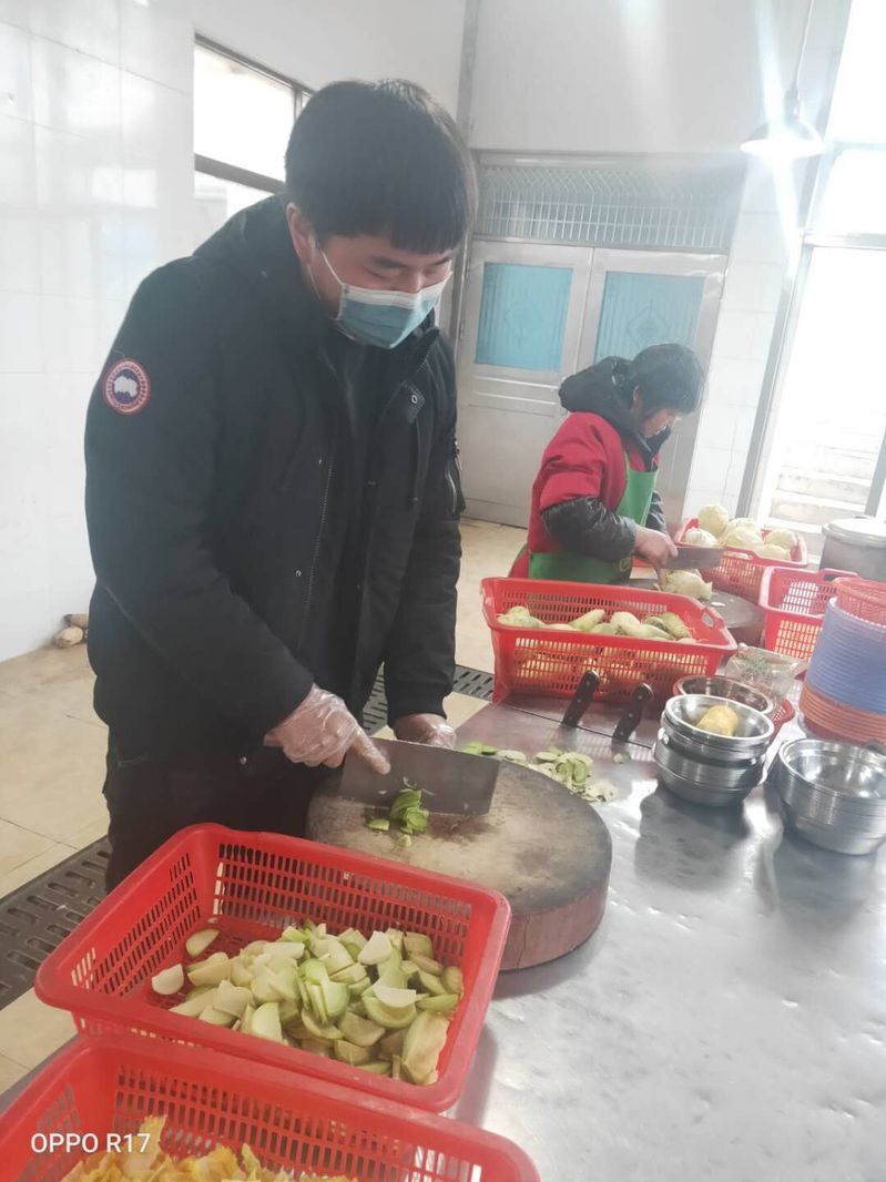 每天早上6:40闹钟响起,黄炎立刻起床,开始摘菜、洗菜、切菜、配餐,伙食房里的这个大男孩从最初的手忙脚乱到现在熟练完成每一道餐食后勤工序,干劲十足,这不仅是劳动带来的成长,更是疫情防控下黄炎所体现出的当代大学生的责任与担当。