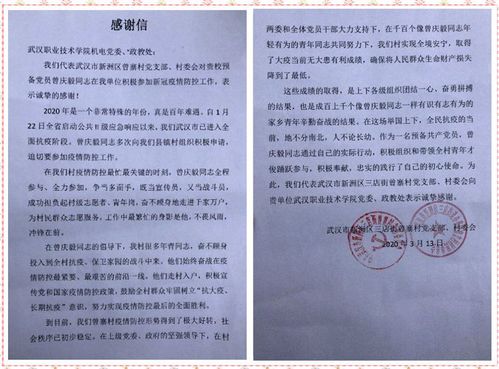 武职网讯(通讯员 樊霞)近日,机电工程学院的电子邮箱骤然“升温”,连续收到武汉市新洲区曾寨村党支部和黄冈市黄梅县蔡山镇蔡山村村委会发来的感谢信,向无私奉献、舍小家顾大家,积极投身疫情防控志愿服务工作的曾庆毅、刘礼等机电学子表达感激之情和赞美之意。
