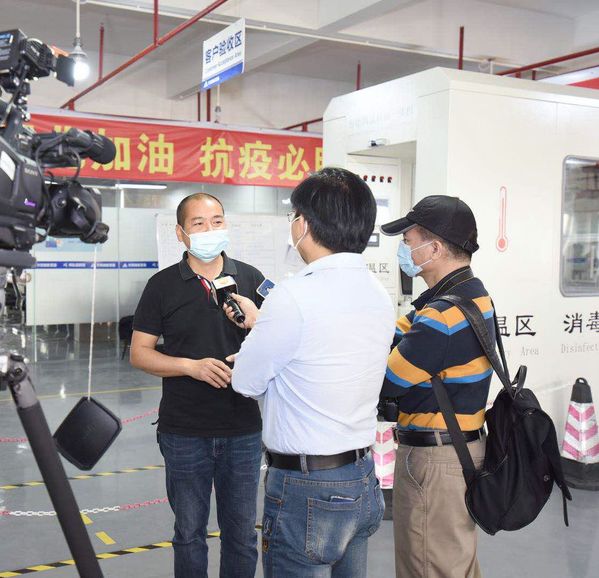 卢勇(左一)接受《中山日报》记者采访