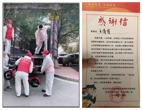图左:王泽宇(右上)协助社区搬运物资 图右:武汉市青山区疫情防控指挥部发来感谢信