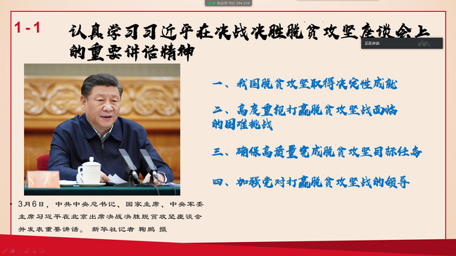 会上,江辉领学了习近平总书记在3月6日出席决战决胜脱贫攻坚座谈会上的重要讲话精神和习近平总书记关于“全面建成小康社会”的重要论述,讲述了我国脱贫攻坚取得的成就,分析了当前面临的严峻形势。江辉强调,要深刻认识到“全面建成小康社会”在“四个全面”中的引领作用,在教育教学中做好引导和宣传,要埋头苦干、真抓实干,确保高质量完成上级党组织安排的脱贫攻坚目标任务。