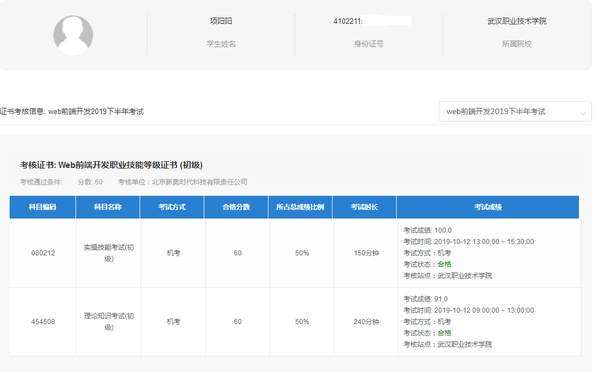 武职网讯(通讯员 邓小飞 卢靖)日前,工业和信息化部教育与考试中心发布了2019年12月底举行的“1+X”Web前端开发职业技能等级证书考试成绩,我校计算机技术与软件工程学院2017级、2018级、2019级计算机网络技术专业的50名师生顺利通过了“1+X”Web前端开发职业技能等级证书考试,其中,初级通过率为78.13%,中级通过率为51.22%,高级通过率高达80%,远高于全国平均通过率,位居全国试点考试院校前列。