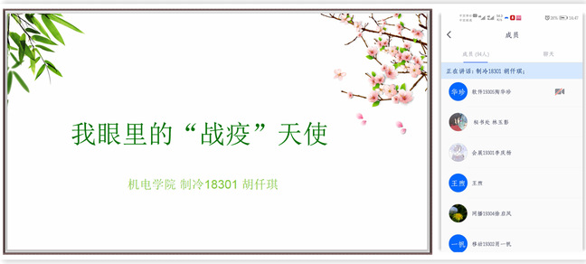 随后,全体社员一起观看了抗疫防疫宣传片。参加分享活动的学子纷纷在线留言:“这是一场没有硝烟的战场!”“抗疫成功,来之不易!”“只有在中国,才会有如此多的医护英雄和志愿者不惧生死冲在最危险的前线!”“我骄傲,因为我是中国人!”……