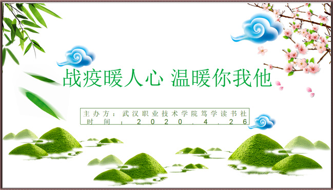武职网讯(通讯员 王祥荣)“最美人间四月天,清丽典雅涉水来”。四月是踏青的季节,时时可见熙熙攘攘,百花攒动。四月更是读书的日子,处处可闻书声琅琅,洋洋盈耳。为迎接第25个世界读书日的到来、增进社团凝聚力,在学校图书馆的大力支持下,笃学读书社举办“战疫暖人心,温暖你我他”线上征文评选及分享活动。