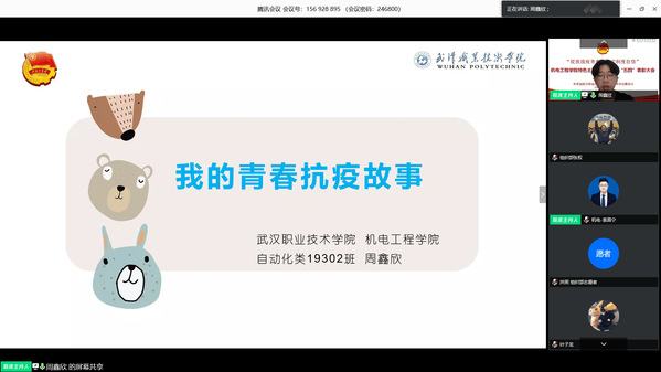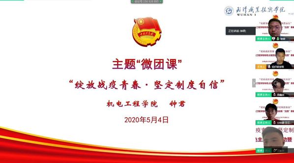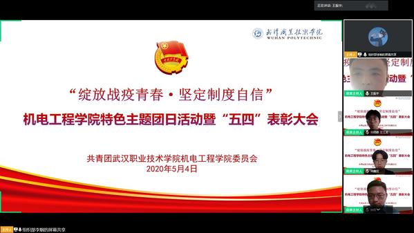 武职网讯(通讯员 王振宇)为纪念五四运动101周年、中国共青团成立98周年,5月4日上午,机电工程学院分团委组织2018、2019级团支部书记、副书记和院团学骨干以“绽放战役青春·坚定制度自信”为主题,以学习总书记关于青年论述和对战疫所作出的指示批示精神为重点,话青春担当,传五四精神,在“云端”开展五四特色主题团日活动。本次活动共200余学生参加,机电工程学院党委副书记钟君、学生管理科办公室负责人袁昌宁参加会议,大会由分团委书记王振宇主持。