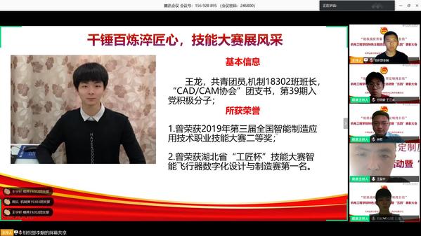在榜样故事分享环节,校级团干标兵、汽营18301班王江龙谈理想信念、学习效率、干事动脑上下功夫,分享自己学习成长的经历;机制18302班王龙以技能大赛上如何淬炼成金、平时如何勤加努力等方面畅聊了自己的感悟;自动化类19302班周鑫欣分享了自己在抗疫志愿服务中所见所得,所感所思,他坚定地表示“疫情还未结束,自己还能战斗”。