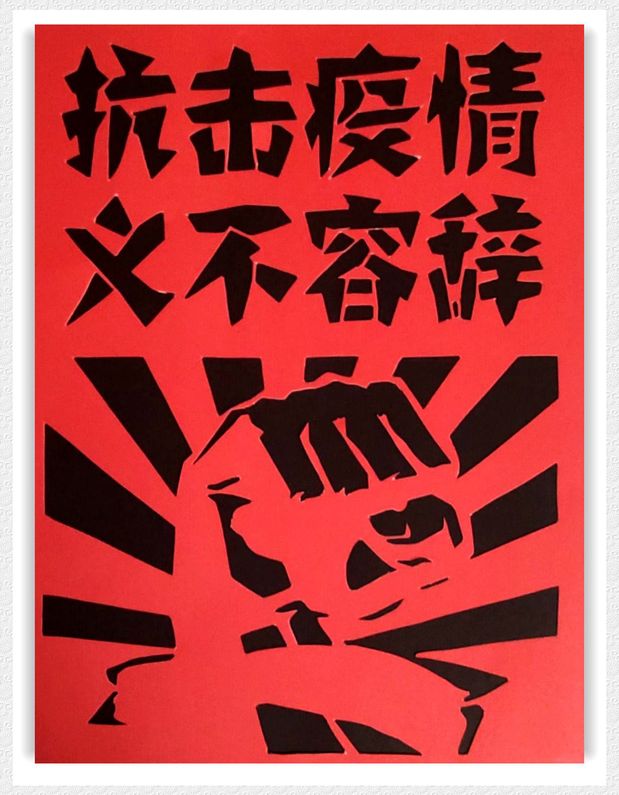2018级邱红梅、刘雪霜、刘晓冬,2019级卢联翔、吕诗婧等社员也积极行动起来,围绕“疫情期间生活”主题,以“一起学习”“搬运赠送物资”“勤通风”“身体好”等作为题材,剪出精美作品;2019级王文慧、王长旭围绕“中国必胜、武汉必胜”主题,创作了“抗击疫情义不容辞”系列作品,表达了武职青春学子为抗疫作贡献的决心。