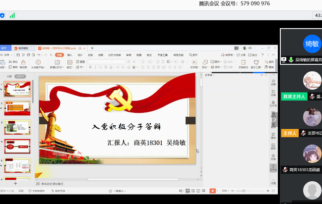 参加线上答辩的学生入党积极分子逐一向党支部汇报了一年来自身在入党动机、政治觉悟、道德品质、现实表现等方面取得的进步。支部委员在每名学生答辩后现场提问,进一步了解学生的理想信念、政治立场、思想素质、对党的认识等方面情况。谷凤凤勉励入党积极分子在学习和生活中要起到模范带头作用,积极向党组织靠拢,并强调成为发展对象并不等同于入党,无论此次是否被确定为发展对象,都要继续加强党性修养。