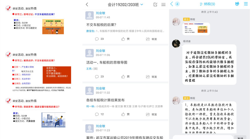 《企业纳税实务》课程主讲教师刘会敏老师针对“3+2”中高职衔接学生的特点,设置多重讨论主题,巧妙地将课程思政内容引入讨论主题,让学生积极发言,培养提高表达和思维能力。