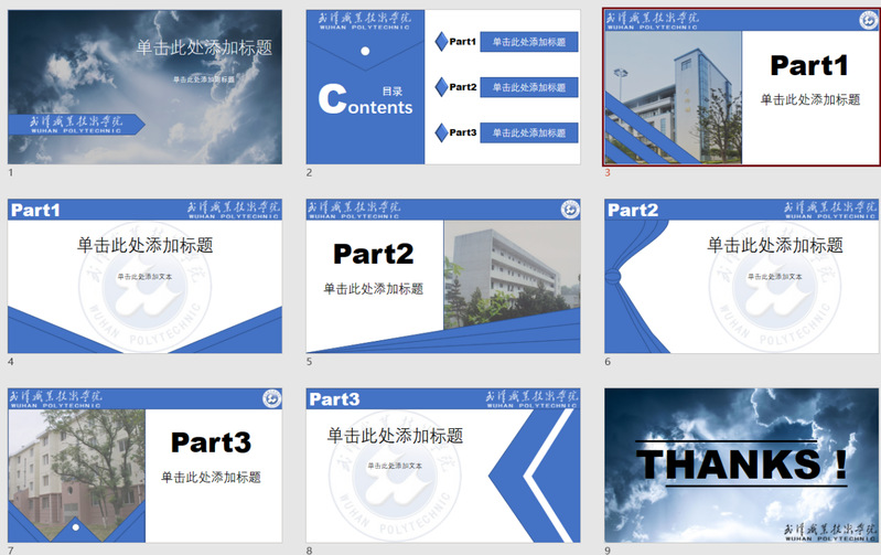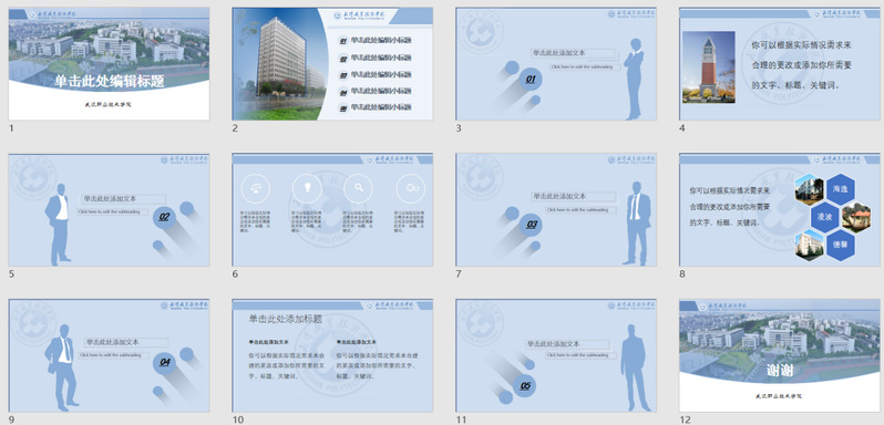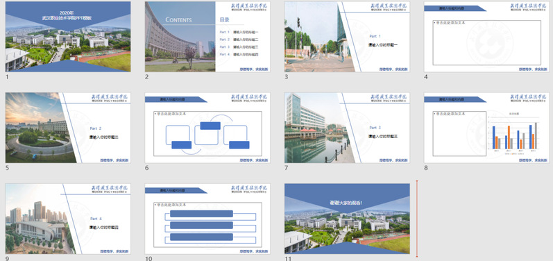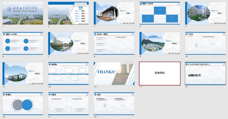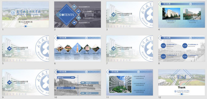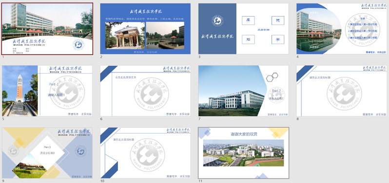 在第六个教学周的《办公及商务软件应用》课程教学中,主讲老师陶琳设计了“我为武职做模板”的教学作业。通过老师在线课程辅导,学生将PPT软件中的配色、图形与线条组合、一图多取、多图排版、LOGO创意使用等手段结合起来,用学校校名、校徽、校训、校园景观图片,制作一套“武汉职业技术学院”主题PPT模板。