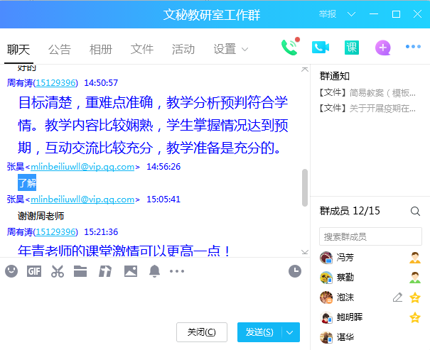 在评课环节,老师们普遍认为公开课三位主讲教师授课逻辑清晰、结构完整、教态规范,结合线上授课特点分小节有序推进,课堂适时停顿进行答疑,气氛轻松活跃,教学效果明显。