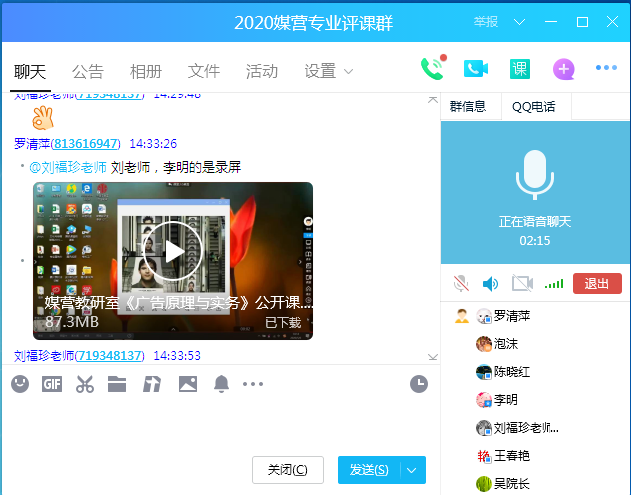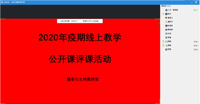 武职网讯(通讯员 曾霞)为搭建疫情防控期间线上教学交流平台,促进各专业教师交流线上教学经验,文化与传媒学院在4月底至5月上旬组织了三场空中听评课活动,全体教职工参加,专职督导周有涛老师受邀参加。