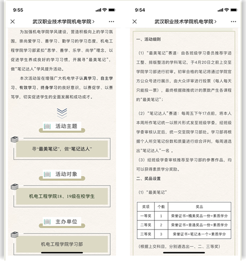 4月20日,机电工程学院分团委发布活动通知,引起机电学子的高度关注,2018级、2019级学生积极响应、踊跃报名,将内容详实、图文并茂的笔记以照片形式提交。本次比赛共收到400余份精美笔记,网络投票3000多张,“最美笔记”推文浏览量高达4000+。