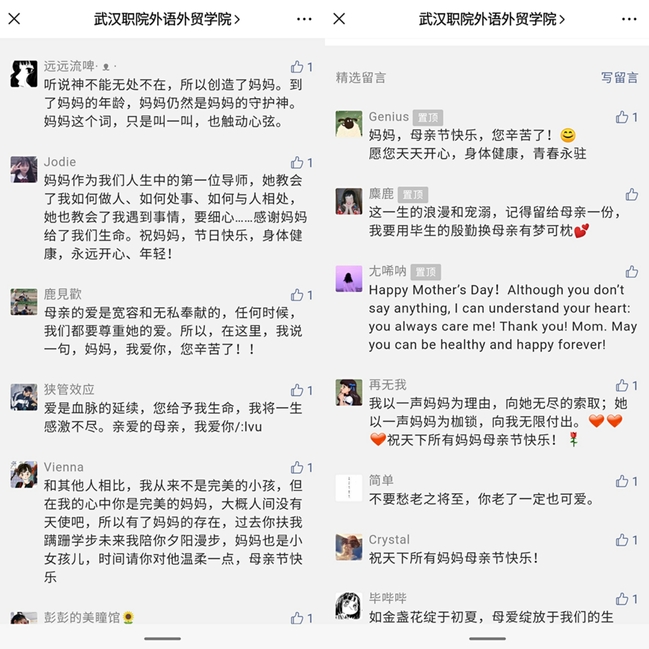 活动自发起以来,外语外贸学院微信公众号留言板上就陆续收到学子们的留言。除了表达对母亲的感恩与爱,“该怎么‘说’出对妈妈的爱”成为讨论重点。写一封信,送一束花,做一餐饭,买一份小礼物,祝一声节日快乐,给母亲一个吻,拍一张合影等等,外语外贸学子在“说”出爱的方式上各抒己见,快乐分享。