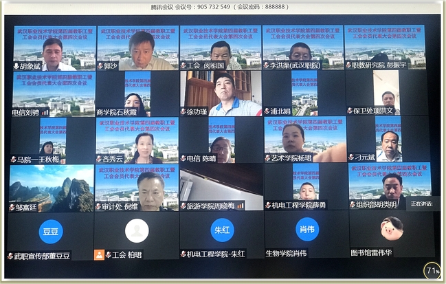 武职网讯(党委宣传部 董豆豆)5月14日,武汉职业技术学院召开第四届四次教职工暨工会会员代表大会。由于疫情影响,本次会议采取视频会议形式进行,全体校领导出席本次会议,8个代表团的149名代表,以及21名列席代表与会。党委书记、校长李洪渠作学校工作报告,党委副书记、工会主席吝秀云作工会工作报告,代表资格审查组组长胡类明、财务处处长曹晓斌、提案审理工作委员会主任李仁平、工会经费审查委员会主任倪维,分别作代表资格审查报告、财务工作报告、提案工作报告、工会经费审查报告。大会由党委副书记胡象斌主持。