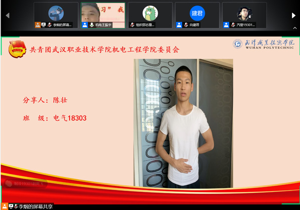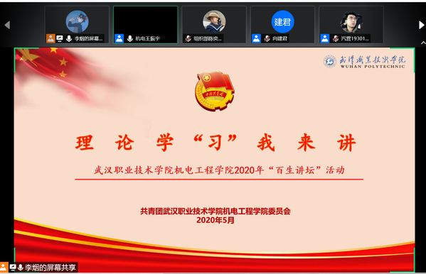 武职网讯(通讯员 王振宇)5月18日晚,机电工程学院分团委以“理论学‘习’我来讲”为主题,以“聊聊你的抗疫故事”为背景,开展2020年“百生讲坛”院级优秀主讲人、活力团支部示范巡讲活动。机电工程学院团学骨干、2019级团支部书记、副书记共200余人相约“云”端,聊战“疫”故事,话责任担当和青春使命,汇聚起在线学习热潮。6位主讲人、2个团支部从不同维度和视角,分享抗疫中的感人故事。