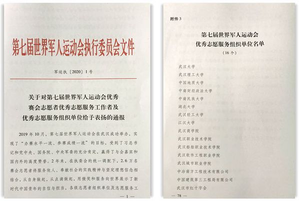 在这场令全世界瞩目的军运盛会中,武职师生不辞辛劳,勇挑重担,圆满完成全部任务,为世界军人运动会的成功举办做出了积极贡献。他们用微笑和服务向世界展示了新时代武职青年的精神风貌和责任担当,受到了军运会执委会、开闭幕式导演团队以及世界各国军运会官员和运动员的广泛赞誉,《中国教育在线》《中国青年报》《新华每日电讯》等媒体报道我校军运会志愿者的青春事迹。第七届世界军人运动会执委会和开闭幕式总导演杨笑分别发来感谢信,向武职师生对军运会的大力支持和志愿服务工作表示赞扬和感谢。