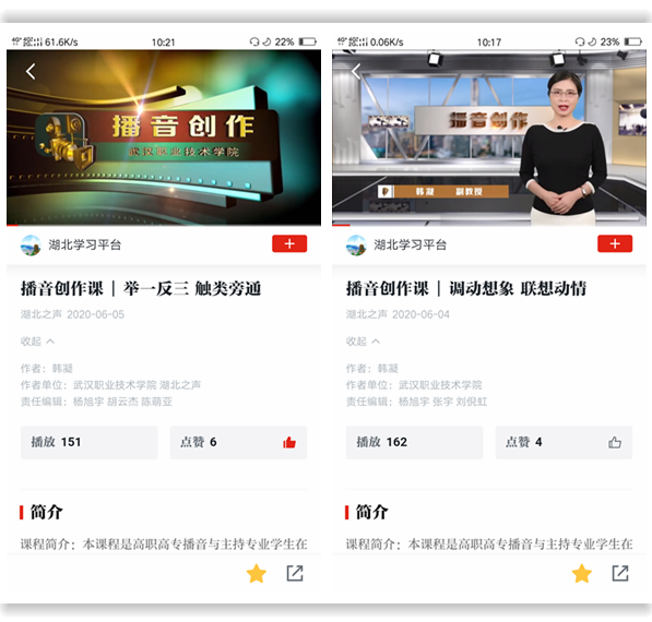 该课程分为导学篇、明道篇、炼术篇、实操篇和资源拓展,共计30个微课视频。在“学习强国”湖北学习平台上线的“情景再现”两个微课,情景设计精细适度,图文音像惟妙惟肖,主讲人仪态优雅大方、发声字正腔圆。在线学习者纷纷点赞,“听韩老师的课,有如沐春风的感觉!”