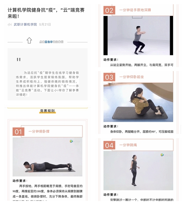 本次竞赛活动历时半个月,旨在帮助学生适应抗疫时期在线学习锻炼需求,提升体质体能水平,倡导良好生活方式。比赛全部在线上展开,赛事组委会根据男女组别分别设置比赛项目,并规定了动作要求和计数办法,男子组项目为俯卧撑、徒手深蹲和跳绳,女子组项目则为仰卧起坐、徒手深蹲和跳绳。比赛项目简单易操作且锻炼效果较好,参赛者在家中或者适宜的场地录制比赛视频即可参赛,比赛视频需要录制三个动作各1分钟的视频,以完成三个动作的有效总个数作为最后成绩。