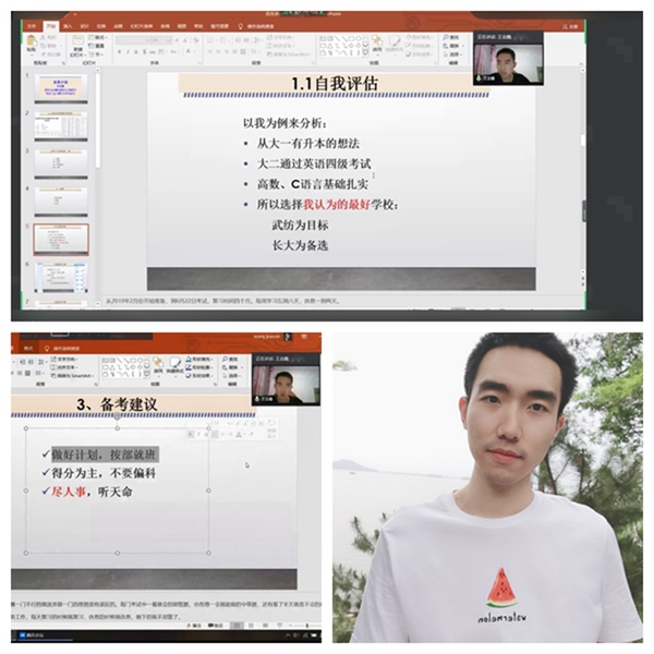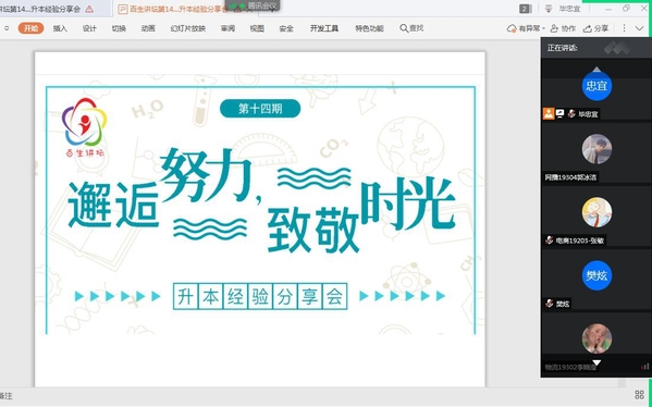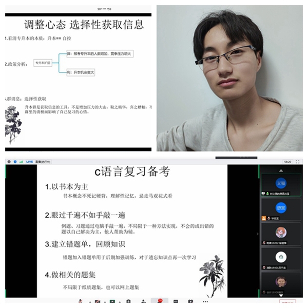 武职网讯(通讯员 彭雨)“急求一份专升本‘秘笈’!‘上岸’学长为你传经送宝,指点迷津。”6月7日晚,计算机技术与软件工程学院第14期百生讲坛《邂逅努力,致敬时光——升本经验交流会》在腾讯会议如期举行。本期活动邀请计算机技术与软件工程学院两名成功通过专升本考试的2019届毕业生担任主讲嘉宾,吸引了300余名学子线上“取经”。