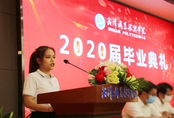外语外贸学院应用法语17301班毕业生谭思敏作为学生代表发言。她回顾了自己三年来在母校留下的美好回忆以及成长与收获,感谢在求学路上给予自己关心和帮助的老师、同学。她对自己扎实的能力、永不放弃的品质感到自信,更为自己在疫情来临时候的情怀和担当感到自豪。“我们有拳拳赤子心,深深爱国情。在危难来临之时,我们不会畏惧、更不回避,我们可以担负起为国分忧、为民出力的责任和使命,让青春在党和人民最需要的地方绽放绚丽之花。”谭思敏激情满怀地说。