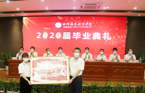 艺术设计学院产品造型专业17302班毕业生胡雨婷,代表全体毕业生上台向母校献礼。她向母校献上了自己精心制作的剪纸雕刻作品——《桃李芬芳》,作品生动再现了同学们在校学习生活的图景,表达了对母校、对老师们的感激之情。