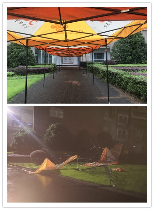 晚上8:36分,后勤服务中心田亚雨的三张图片,打破了“武职技能高考”工作群片刻的安静。图片中,帐篷都被风雨掀翻在地,篷布破损、支架零落。现场各种信息陆续传来 “计算机学院的帐篷全部损坏”、“测温通道帐篷全部被吹坏”、“旅游楼门口部分帐篷被吹倒”。