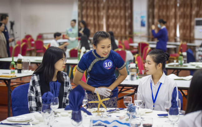 我校选手伍秋月(左二)在比赛现场为模拟客人提供宴会服务