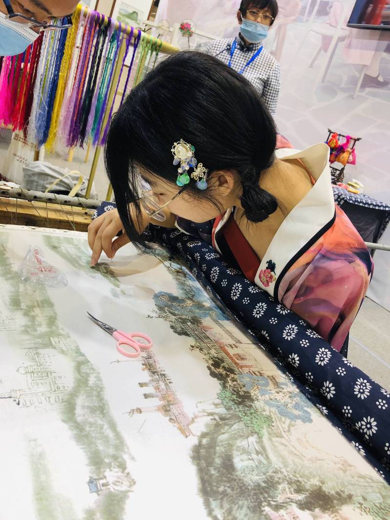 在光谷科技会展中心展演现场,十余位身着古典汉裳的武职学子带着虔诚的心,从普通人眼里的“神技”——劈丝开始,绣制长达五米的《锦绣江城》画卷,展示汉绣技艺,表达对大美江城的深深祝福。“劈丝”是刺绣中的精湛技法,可将一根绣花线劈成二份、四份、八份、十六份,并通过双手上下穿梭,绣出层层叠叠深浅明暗。劈丝越细,作品在视觉和手感上越细腻。展示活动中,武职学子牵引“四丝”,巧手翻飞,主要采用黄春萍大师独创的“似绣非画、似画非绣”绘画刺绣结合法绣制《锦绣江城》,将如画如绣的江城美景呈现给观摩者。