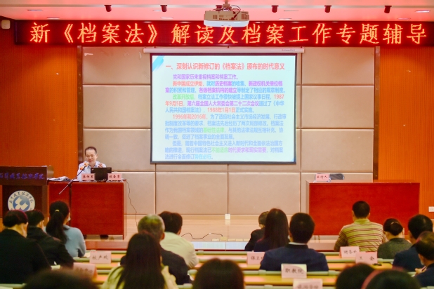 袁作军以《履行党管档案工作政治责任,为新时代档案事业发展提供保障》为题,阐述了新修订的《档案法》颁布的时代意义、《档案法》修订的实质内涵以及如何抓好《档案法》贯彻落实等方面内容。他说,2020年6月20日第十三届全国人民代表大会常务委员会第十九次会议修订的《档案法》将自2021年1月1日起施行。此次《档案法》的修订,坚持以习近平新时代中国特色社会主义思想为科学指引,贯彻落实党中央、国务院的决策部署,总结实践经验,致力解决制约档案事业发展的瓶颈问题,是档案工作适应国家治理体系和治理能力现代化要求,走向依法治理、走向开放、走向现代化的重要标志,对促进新时代档案事业高质量发展,具有重大意义和深远影响。高校要准确把握《档案法》的实质内涵,理顺体制机制,健全制度设计,加大开放力度,构建安全管理体系,推动信息化建设,强化监督检查,明确法律责任,增强科技人才。武汉职院档案工作基础十分扎实,更要进一步抓好《档案法》的宣传普及,完善配套制度,在高校档案工作中起到示范引领的作用。