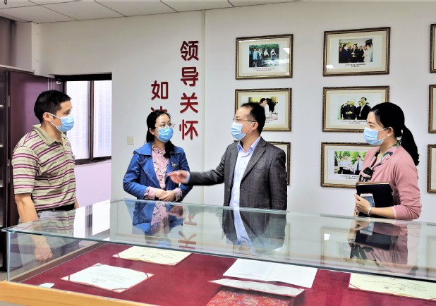 湖北省委办公厅档案行政管理处二级调研员袁作军(右二)在我校档案陈列室检查指导工作