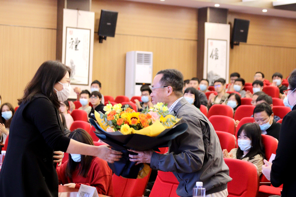韩籍专家STEVEN先生从OLED 屏幕的发展趋势、应用场景及市场、OLED 屏幕的关键技术三个方面进行解读,讲解了面板行业的尖端技术,并简要介绍了三星、京东方、华星、索尼、苹果等公司在OLED 屏幕柔性面板方向的研发情况。STEVEN先生逐一展示对折屏、三折屏、四折屏的应用场景,就OLED 屏幕技术等相关内容与参会师生和观看直播的听众进行交流互动,并提出OLED 屏幕未来将向大屏、可柔性并与其他技术(摄像头、指纹、传感器)相叠加的观点。他说:“OLED 屏幕市场增长率高,每年增长不低于10%,市场前景很乐观,相关专业的学生就业空间很广阔。”STEVEN先生鼓励电信学子努力做有智慧的研发工程师,讲座在师生代表向steven先生献花后落下帷幕。