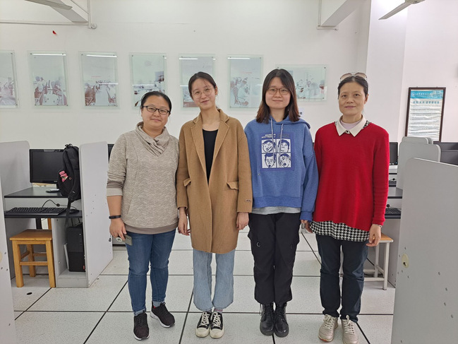 写作大赛获奖选手龚雨晴(左二)、李诗绚(右二)和指导老师谭妍(左一)、陈慧(右一)合影