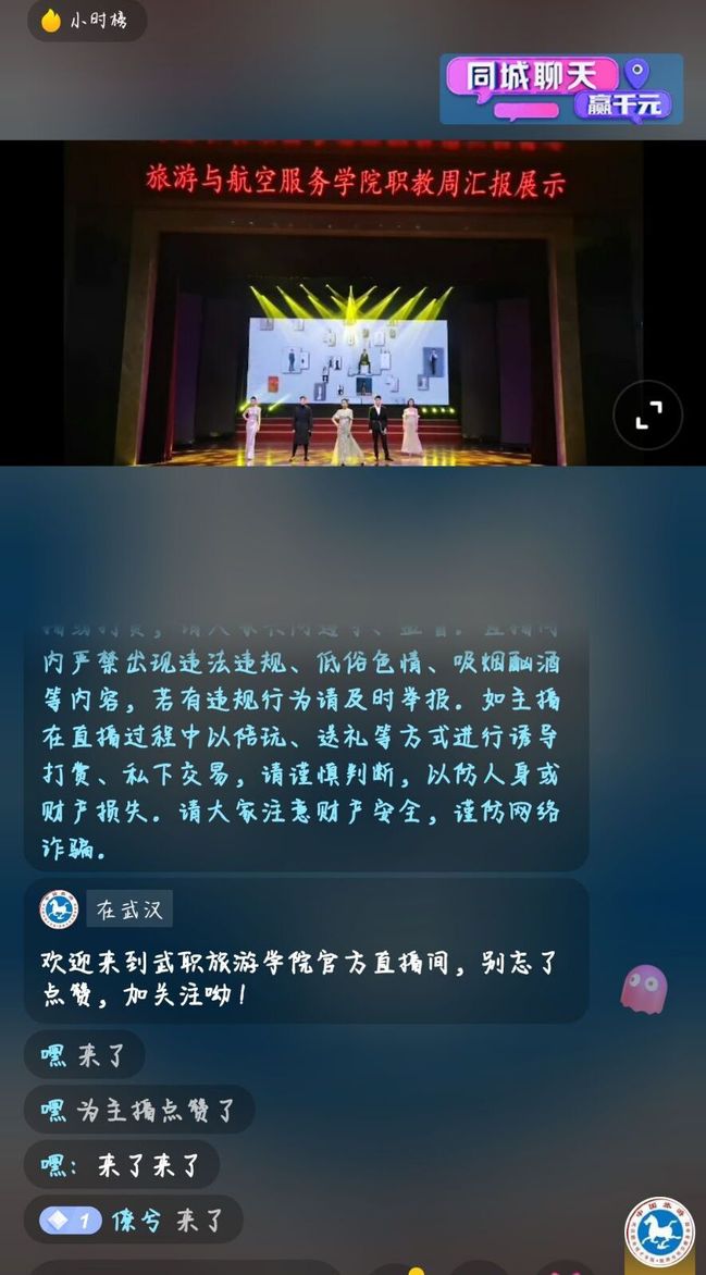 11月15日,在旅游与航空服务学院官方抖音直播间,舞蹈“情满黄鹤楼”再一次把师生带回那段抗“疫”岁月,大家纷纷在公屏上留言:“黄鹤楼的烟火气回来了”。空乘学子在全国高等学校民航服务技能大赛闭幕式上表演的舞蹈“加油,武汉”,将全国人民众志成城、团结奋战并最终取得新冠疫情防控阻击战阶段性胜利的喜悦之情传递给每一位观众。