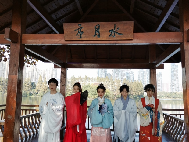 当日上午,天朗气清,惠风和畅。师生一行身着华彩汉裳,结伴游走于风景美如画的东湖山水亭阁间,开展“游园吟诗、汉服礼仪展示、汉服走秀活动。文化传媒学子阳光自信,宽大的衣袖,繁褥的纹饰,精致的头饰,小巧的鞋履,举手投足间,展示了汉服之美和华夏礼仪之盛,精彩的表演吸引了过往行人驻足观赏。