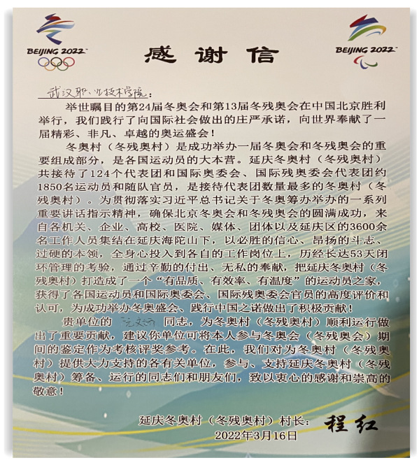 武职网讯(通讯员 严芮)当冰雪之约遇见中国文化,2022年北京冬奥会和冬残奥会举世瞩目。北京作为首个“双奥之城”成就了很多志愿者“双奥”之梦,武汉职业技术学院纺织与服装工程学院服设19303班阮文娇就是其中之一。