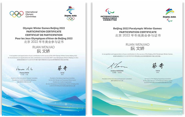 阮文娇的冬奥会参与证书(左)和冬残奥参与证书(右)