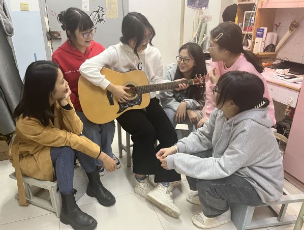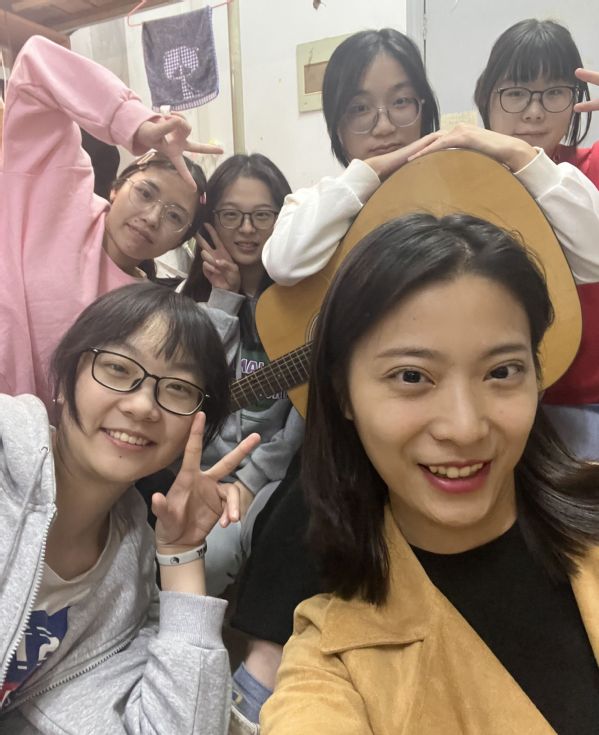 有一次,我像往常一样走进508。没想到,开门迎接我的是一把吉他。女孩们说最近学会了弹吉他,想让老师听她们弹唱几首歌曲。我惊喜不已,坐下,抬头,看着她们拨和弦彼此呼应,仿佛在听演唱会。一曲终了,我仍沉醉于表演。