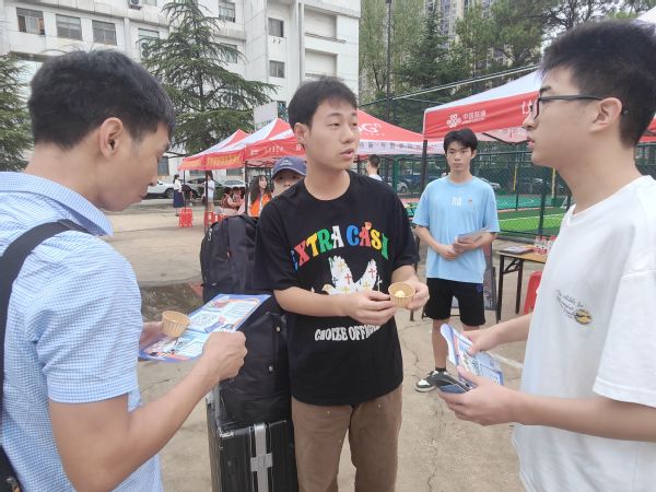 与此同时,进行防诈宣传的预备党员志愿者们向新生及家长们发放传单,耐心讲解常见诈骗套路,呼吁第一次远离家人的萌新们提高警惕,为新生平安快乐的校园生活保驾护航。