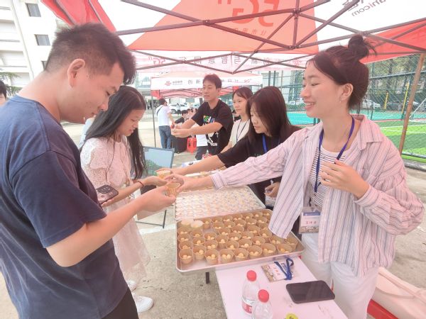 为消除新生及家长舟车劳顿后的疲惫,生物工程学院特别设立了“甜蜜的关心”心意点,免费发放学院特色项目“味觉工坊”糕点房制作的500份椰蓉球点心,送上满满的能量补给。此外,还设置了“诚挚的真心”祝福点、“永恒的开心”打卡点以及“持久的安心”防诈宣传点。