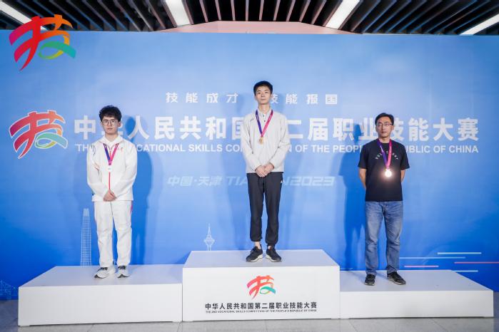 武汉职业技术学院教师王龙(中)获中华人民共和国第二届职业技能大赛增材制造设备操作赛项金牌