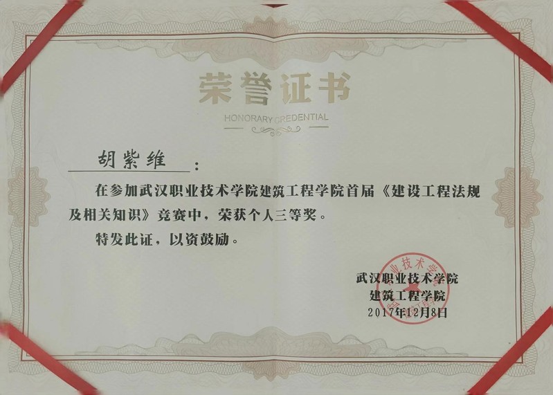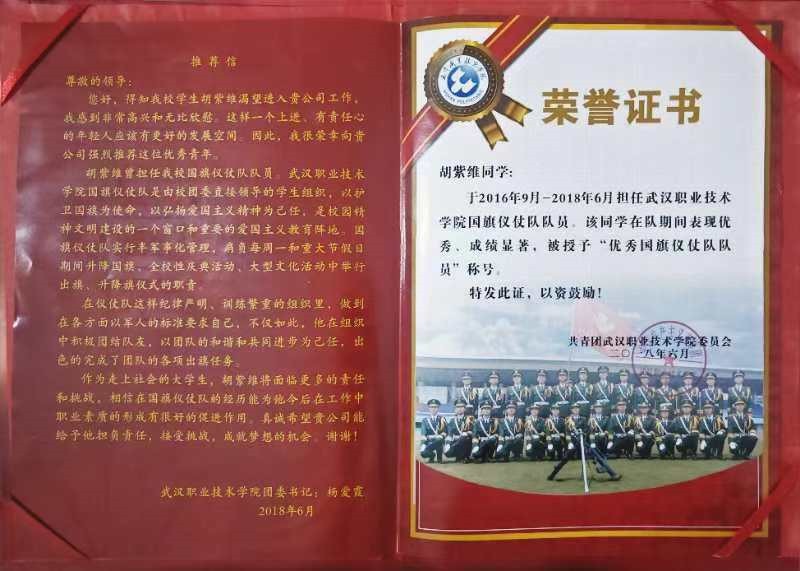 在校期间,他积极投身校园各项活动与学习。“记得参加建筑工程学院首届建筑法规大赛时,我日夜准备,就想着一定要全力以赴。”最终,胡紫维表现出色,荣获个人三等奖。此外,他还加入了武汉职业技术学院国旗仪仗队,“当时加入仪仗队,每天都要早起训练,真的很辛苦。现在回想,那是一段非常珍贵的经历。”在仪仗队的辛勤付出,让他收获了“优秀队员”的荣誉称号。