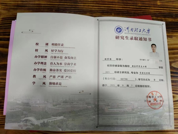 考研期间,一边工作一边备考的他,凭借在武职国旗仪仗队养成的早起习惯和磨练出的坚强意志,坚持在公交车上背单词,在地铁上背专业课,在工作闲暇时学习。最终,他以同等学力报考河南理工大学安全工程硕士研究生,并2021年9月顺利入学。