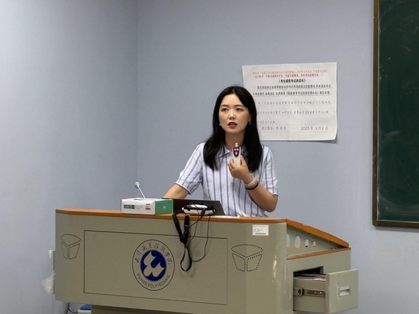 会上,光电与信息工程学院五个教学团队分别进行8分钟教学展示,呈现前沿技术与教学创新融合的实践成果。《智能小车红外循迹功能调试》团队通过沙盘模拟与故障分析,将工业自动化技术融入实训教学;《守护芯片封装的命门 - 固晶质检的标准化流程》团队结合晶粒目检和微观五步,实现精密质检流程可视化教学;《传送带驱动中的 “永动密码”- 解密自锁功能设计》团队以工程问题为导向,借助电工课堂 AI 助理与仿真演示破解电路设计难题;《解码 CCD 光电密钥,智绘视界精彩》团队从器件原理延伸至手机摄影优化,打造沉浸式光电实验课堂;《探秘 5G 基站核心 - BBU 单板结构功能初认知》团队依托虚拟仿真平台,突破传统通信教学空间限制。
