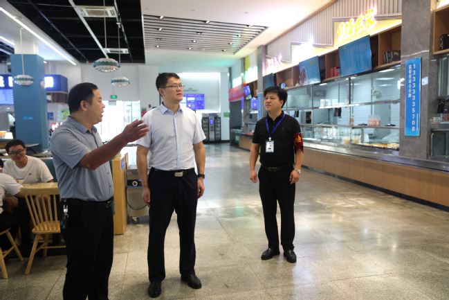检查组一行先后前往光谷校区监控室(110指挥中心)、校园出入口、东三食堂、笃学社区及学校总值班室等重点场所,逐项核查校园安全管理落实情况。在监控室,何保华仔细查看视频监控覆盖范围与实时运行状态,要求保卫处紧盯重点区域,确保应急响应快速高效;在校园大门,他详细询问外来人员登记流程、车辆进出管控措施,强调要筑牢校园安全“第一道防线”;在东三食堂,他仔细检查食材储存、餐具消毒及食品留样管理等工作,叮嘱食堂工作人员严格把控饮食安全,保障师生假期用餐品质;在总值班室,他认真查阅值班记录台账,要求值班人员严格执行24小时在岗制度,确保各类突发情况及时处置、高效反馈。每到一处,何保华均认真听取点位负责人工作汇报,针对检查中发现的问题现场提出整改要求,对工作推进中遇到的困难逐一协调解决,确保假期校园安全管理无死角、无漏洞。