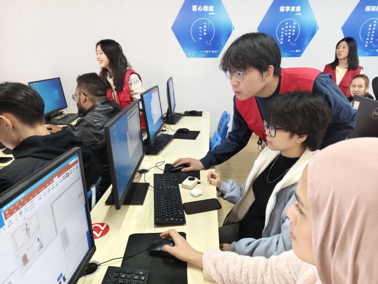 实践环节中,留学生们在陈觎的引领下,同步操作电脑,借助豆包AI与即梦AI平台,先后生成中国古代诗人形象与个人虚拟分身。教室内学习氛围浓厚,不少留学生主动举手请教,探讨如何优化提示词以提升画面质感。陈觎和人工智能学院(信创产业学院)学生志愿者穿梭于各小组之间,细致解答操作难题,指导全部留学生顺利完成专属创意作品。